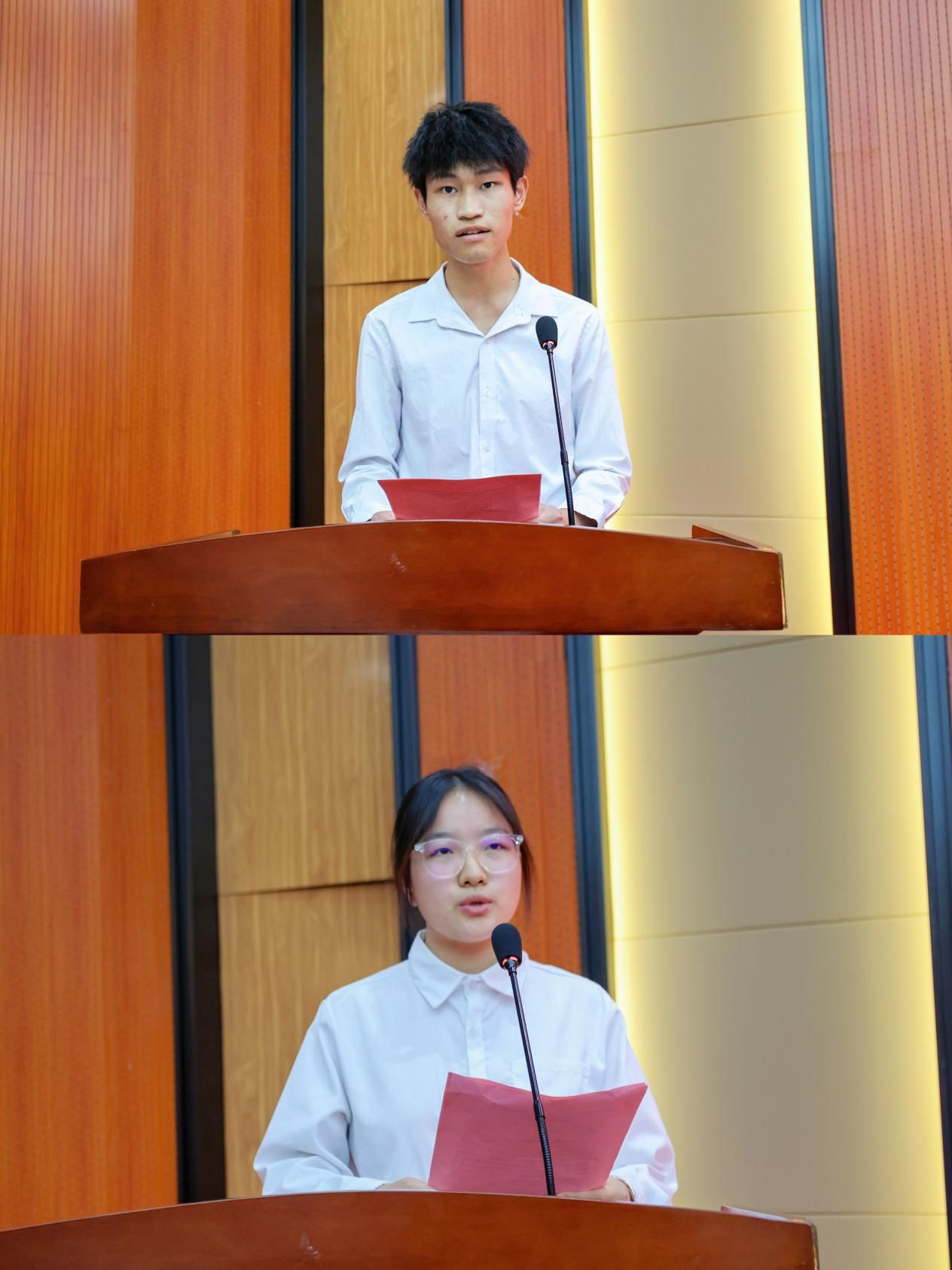 肖志华、关开荣分别宣读了“川泉”奖学金和“爱云”奖学金的获奖者名单。“川泉”奖学金获奖者代表冶金222班王宇和“爱云”奖学金获奖者代表材控241班李春燕分别上台发言。他们深切表达了对关心支持教育事业的校友感激之情,并分享了他们在校的专业学习和实践创新经历,两位同学的演讲极大地触动了全场师生,也以自己的言行默默感染了身边的同学。