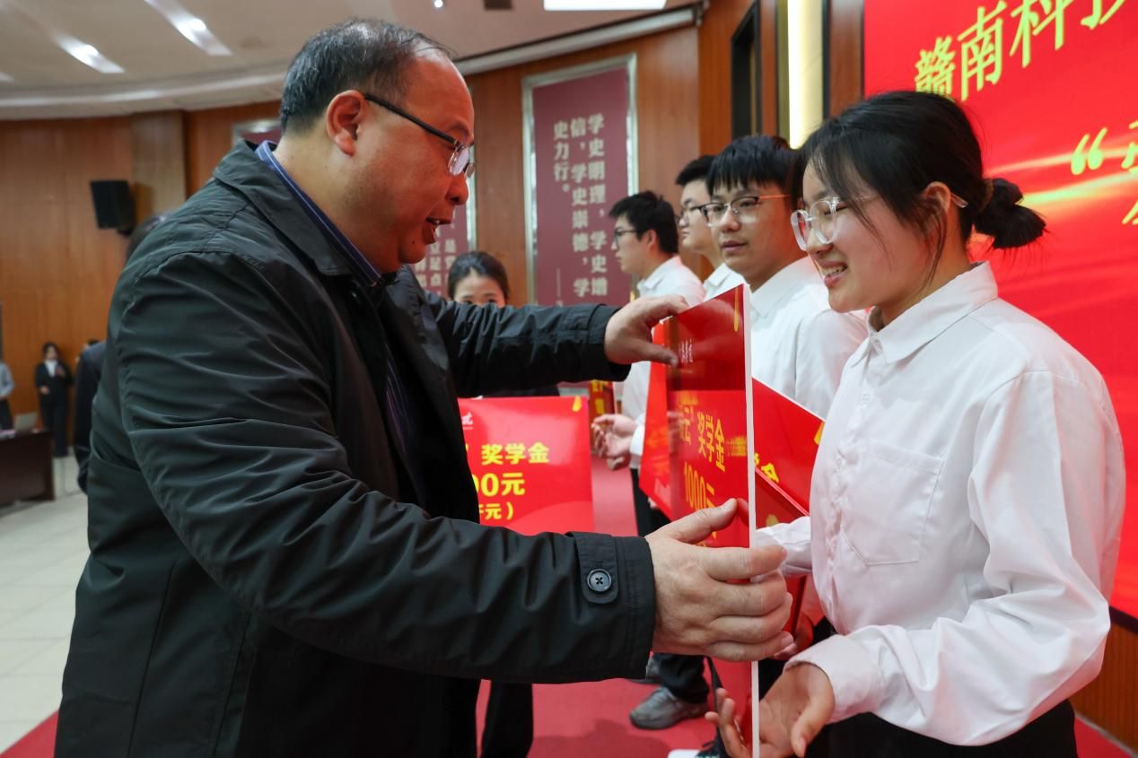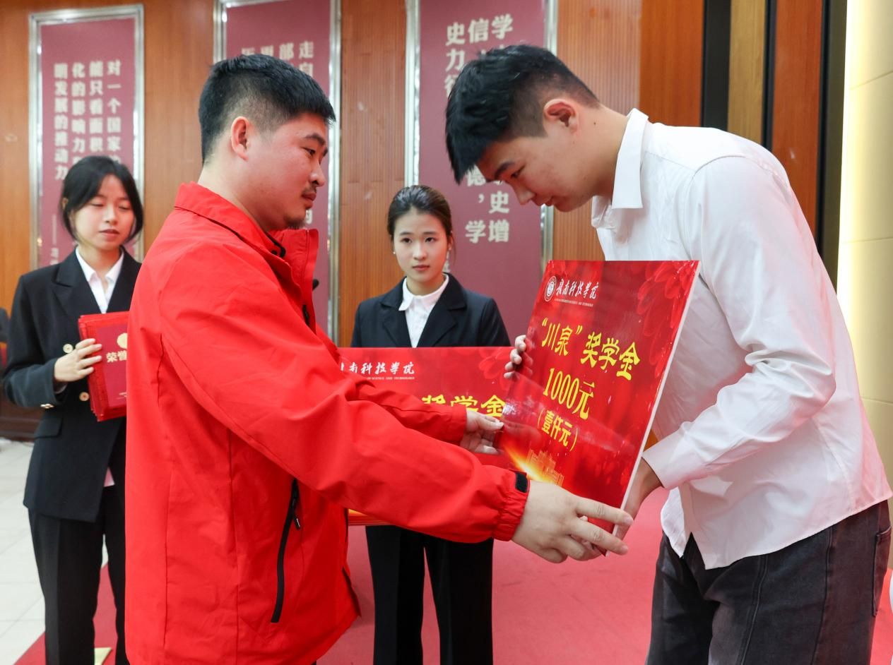 曾庆鸿为获“川泉”奖学金学生颁发荣誉证书及奖金牌,左群为获“爱云”奖学金学生颁发荣誉证书及奖金牌,台下响起热烈掌声。