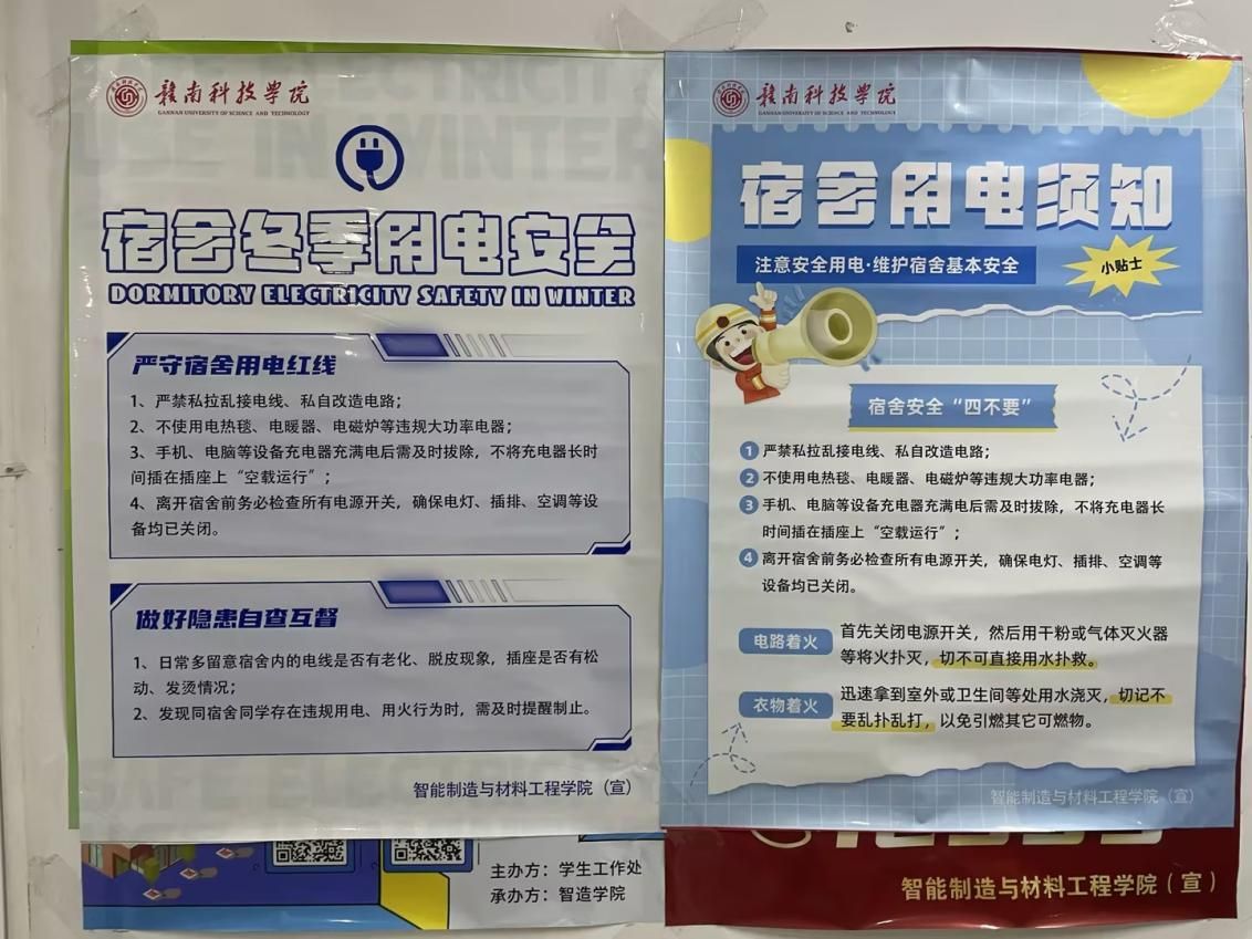 由辅导员、党员干部组成12个检查小组,对全院学生宿舍开展"拉网式"排查。重点检查违规电器使用、私拉电线、易燃物堆积等问题,累计发现并整改隐患若干处,包括劝诫不使用大功率电器、阳台杂物清理、规范充电行为。检查过程中,工作人员同步建立"一宿舍一档案",对存在多次违规的宿舍开展"一对一"安全教育。